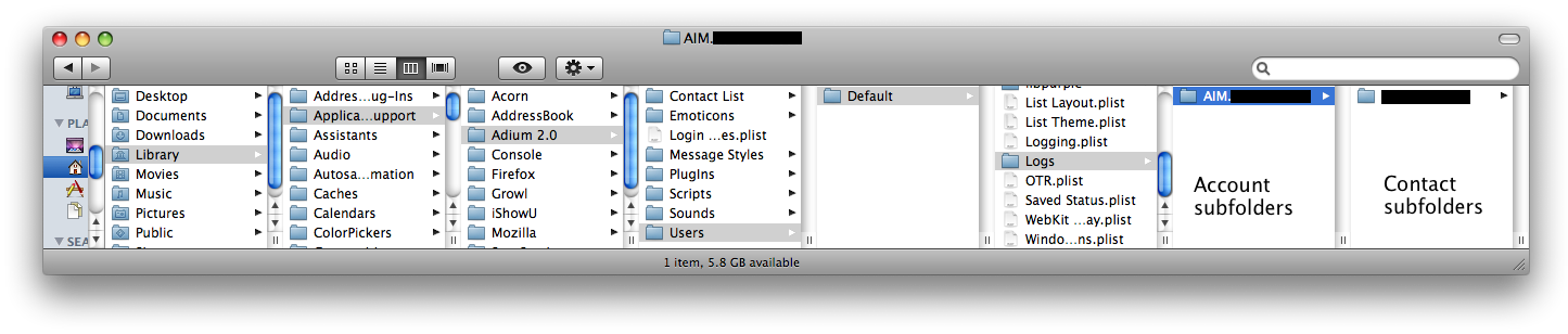 3. The contents of that folder are subfolders, one per account; the contents of each subfolder are more subfolders, one per contact. So, for example, if your AIM username is jdoe and you have a contact named jsmith, the logs folder will contain a folder named “AIM.jdoe” that contains a subfolder named “jsmith”.